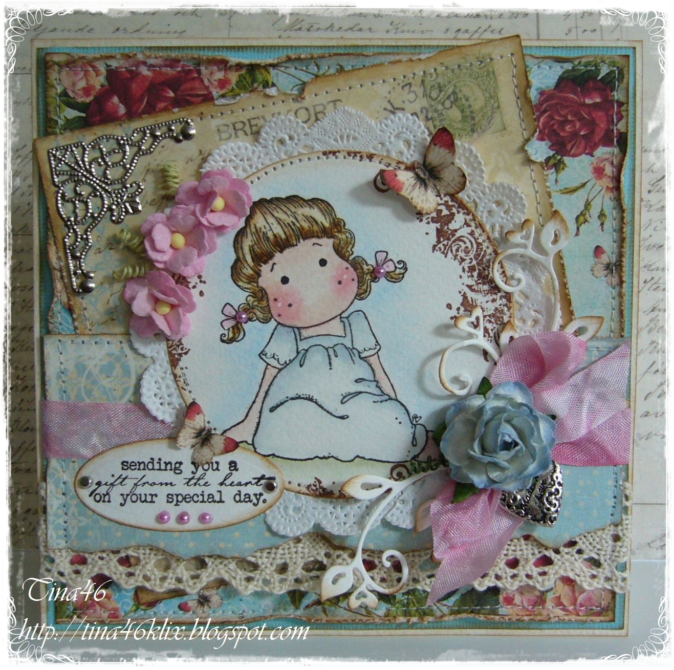 Meine Karte habe ich mit der Sweetie Tilda von Magnolia gestaltet.Koloriert habe ich mit Distress Ink und gestempelt mit Versafine Onyx Black. Das Rosenpapier habe ich selbst entworfen die anderen Motivpapier sind von Pion -Design.Der schöne Heart-Swirl ist ein Magnolia Dies. Die Blumen ,das Zierdeckchen und die schöne Metallecke sind vom Wild Orchid Chrafts Shop .